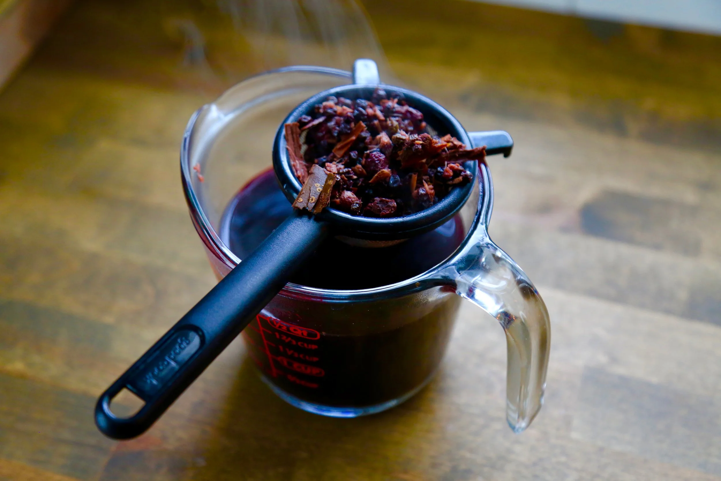 Strain herbs from liquid. Be sure to press out all liquid from strainer using a spoon in order to extract all the remaining liquid from the herb matter.